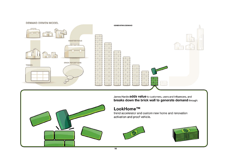 | DEMAND DRIVEN MODEL SMARTER TOOLS BRICK PERCEPTIONS TRENDS GENERATING DEMAND James Hardie adds value to customers, users and influencers, and breaks down the brick wall to generate demand through: LookHomTM trend accelerator and custom new home and renovation activation and proof vehicle. |