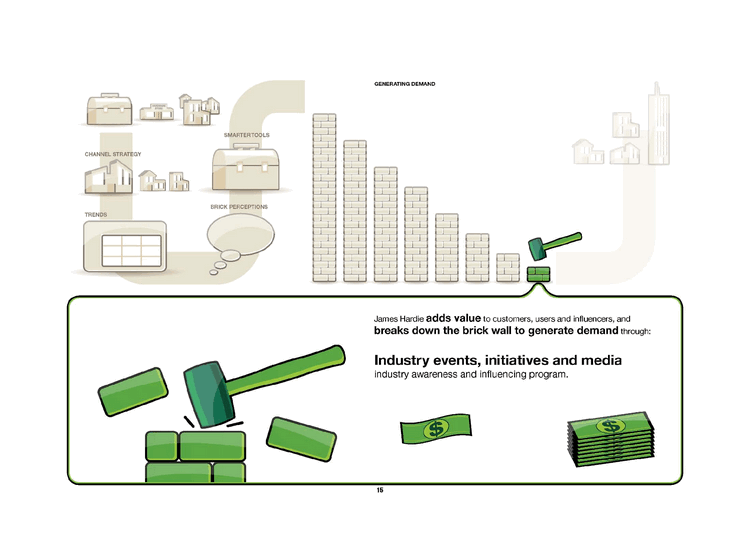 | CHANNEL STRATEGY SMARTER TOOLS BRICK PERCEPTIONS TRENDS GENERATING DEMAND James Hardie adds value to customers, users and influencers, and breaks down the brick wall to generate demand through: Industry events, initiatives and media industry awareness and influencing program. |