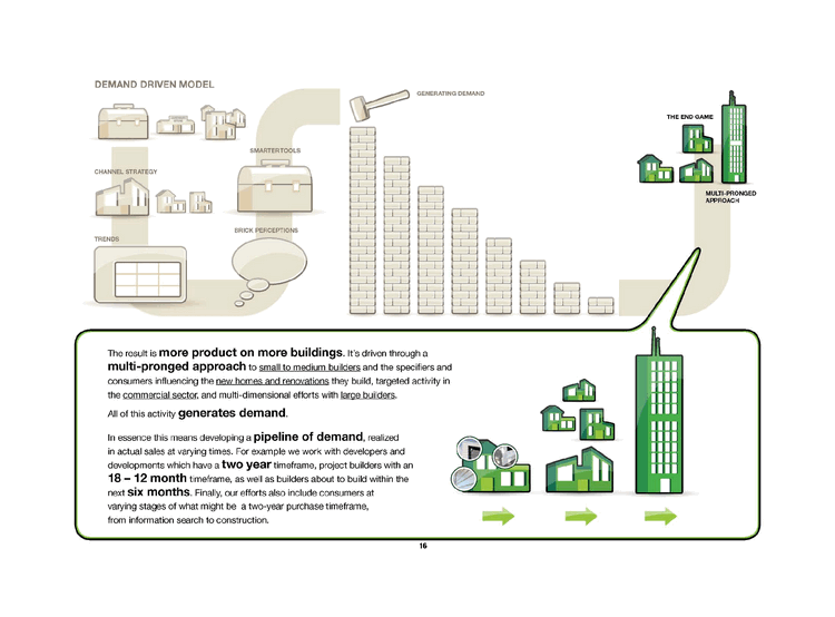 | DEMAND DRIVEN MODEL GENERATING DEMAND SMARTERTOOLS CHANNEL STRATEGY TRENDS BRICK PERCEPTIONS THE END GAME MULTI-PRONGED APPROACH The result is more product on more buildings. It's driven through a multi-pronged approach to small to medium builders and the specifiers and consumers influencing the new homes and renovations they build, targeted activity in the commercial sector, and multi-dimensional efforts with large builders. All of this activity generates demand. In essence this means developing a pipeline of demand, realized in actual sales at varying times. For example we work with developers and developments which have a two year timeframe, project builders with an 18 - 12 month timeframe, as well as builders about to build within the next six months. Finally, our efforts also include consumers at varying stages of what might be a two-year purchase timeframe, from information search to construction. MULTI PRONGED APPROACH THE END GAME |