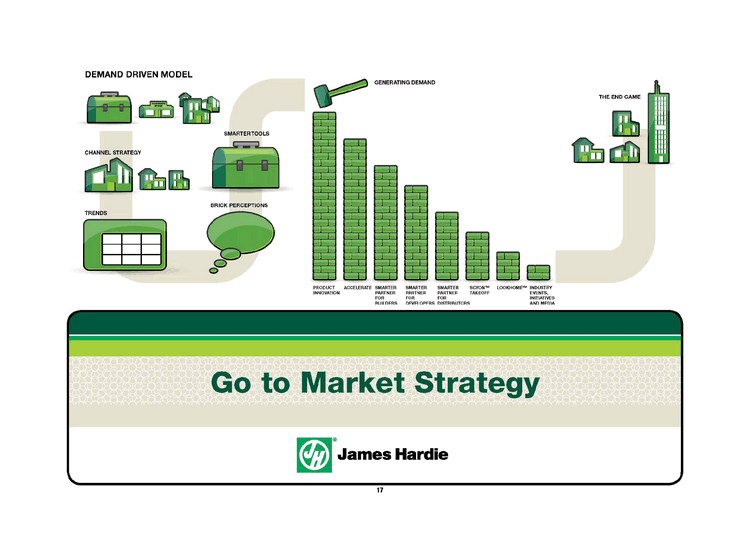 | DEMAND DRIVEN MODEL GENERATING DEMAND CHANNEL STRATEGY TRENDS SMARTER TOOLS BRICK PERCEPTIONS PRODUCT ACCELERATE SMARTER SMARTER SMARTER SCYONTM LOOKHOMETM INDUSTRY INNOVATION PARTNER PARTNER PARTNER TAKEOFF EVENTS, FOR FOR FOR INITIATIVES BUILDERS DEVELOPERS DISTRIBUTORS AND MEDIA Go to Market Strategy James Hardie THE END GAME |