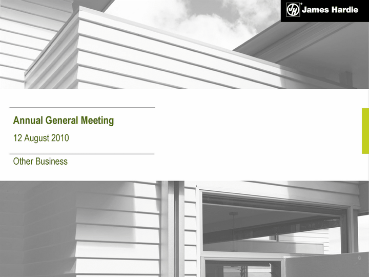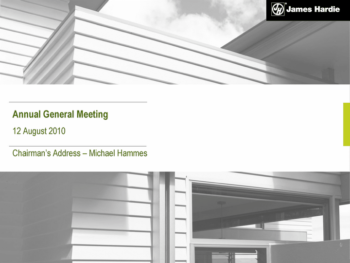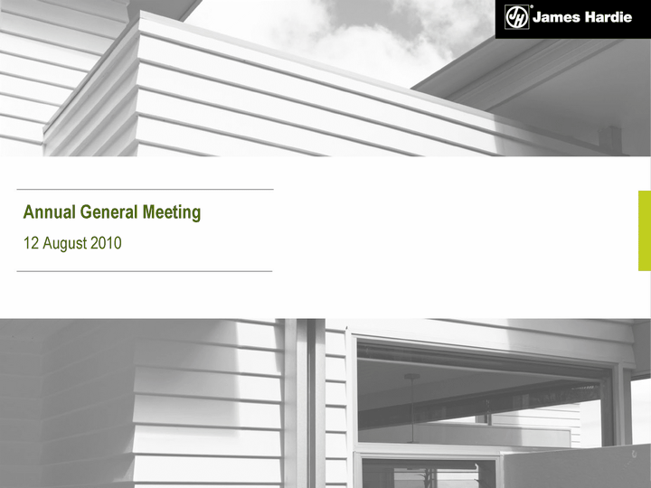 | Disclaimer This Presentation contains forward-looking statements. James Hardie may from time to time make forward-looking statements in its periodic reports filed with or furnished to the United States Securities and Exchange Commission on Forms 20-F and 6-K, in the annual reports to shareholders, in offering circulars, invitation memoranda and prospectuses, in media releases and other written materials and in oral statements made by the Company's officers, directors or employees to analysts, institutional investors, existing and potential lenders, representatives of the media and others. Statements that are not historical facts are forward-looking statements and such forward-looking statements are statements made pursuant to the Safe Harbor Provisions of the Private Securities Litigation Reform Act of 1995. Examples of forward-looking statements include: statements about the Company's future performance; projections of the Company's results of operations or financial condition; statements regarding the Company's plans, objectives or goals, including those relating to its strategies, initiatives, competition, acquisitions, dispositions and/or its products; expectations concerning the costs associated with the suspension or closure of operations at any of the Company's plants and future plans with respect to any such plants; expectations that the Company's credit facilities will be extended or renewed; expectations concerning dividend payments; statements concerning the Company's corporate and tax domiciles and potential changes to them, including potential tax charges; statements regarding tax liabilities and related audits, reviews and proceedings; statements as to the possible consequences of proceedings brought against the Company and certain of its former directors and officers by the ASIC; expectations about the timing and amount of contributions to the AICF, a special purpose fund for the compensation of proven Australian asbestos-related personal injury and death claims; expectations concerning indemnification obligations; statements about product or environmental liabilities; and statements about economic conditions, such as the levels of new home construction, unemployment levels, the availability of mortgages and other financing, mortgage and other interest rates, housing affordability and supply, the levels of foreclosures and home resales, currency exchange rates and consumer confidence. Words such as "believe," "anticipate," "plan," "expect," "intend," "target," "estimate," "project," "predict," "forecast," "guideline," "aim," "will," "should," "likely," "continue" and similar expressions are intended to identify forward-looking statements but are not the exclusive means of identifying such statements. Readers are cautioned not to place undue reliance on these forward-looking statements and all such forward-looking statements are qualified in their entirety by reference to the following cautionary statements. Forward-looking statements are based on the Company's current expectations, estimates and assumptions and because forward-looking statements address future results, events and conditions, they, by their very nature, involve inherent risks and uncertainties, many of which are unforeseeable and beyond the Company's control. Such known and unknown risks, uncertainties and other factors may cause the Company's actual results, performance or other achievements to differ materially from the anticipated results, performance or achievements expressed, projected or implied by these forward-looking statements. These factors, some of which are discussed under "Key Information - Risk Factors" beginning on page 6 of the Form 20-F filed with the US Securities and Exchange Commission on 30 June 2010, include, but are not limited to: all matters relating to or arising out of the prior manufacture of products that contained asbestos by current and former James Hardie subsidiaries; required contributions to the AICF, any shortfall in the AICF and the effect of currency exchange rate movements on the amount recorded in the Company's financial statements as an asbestos liability; proposed governmental loan facility to the AICF; compliance with and changes in tax laws and treatments; competition and product pricing in the markets in which the Company operates; seasonal fluctuations in the demand for our products; the consequences of product failures or defects; exposure to environmental, asbestos or other legal proceedings; general economic and market conditions; the supply and cost of raw materials; the success of research and development efforts; the potential that competitors could copy our products; reliance on a small number of customers; a customer's inability to pay; compliance with and changes in environmental and health and safety laws; risks of conducting business internationally; compliance with and changes in laws and regulations; the effect of the Company's transfer of its corporate domicile from The Netherlands to Ireland to become an Irish SE including employee relations, changes in corporate governance, potential tax benefits and the effect of any negative publicity; currency exchange risks; the concentration of the Company's customer base on large format retail customers, distributors and dealers; the effect of natural disasters; changes in the Company's key management personnel; inherent limitations on internal controls; use of accounting estimates; and all other risks identified in the Company's reports filed with Australian, Irish and US securities agencies and exchanges (as appropriate). The Company cautions that the foregoing list of factors is not exhaustive and that other risks and uncertainties may cause actual results to differ materially from those in forward-looking statements. Forward-looking statements speak only as of the date they are made and are statements of the Company's current expectations concerning future results, events and conditions. 2 |