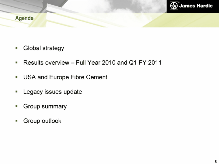 | Agenda Global strategy Results overview - Full Year 2010 and Q1 FY 2011 USA and Europe Fibre Cement Legacy issues update Group summary Group outlook 5 |