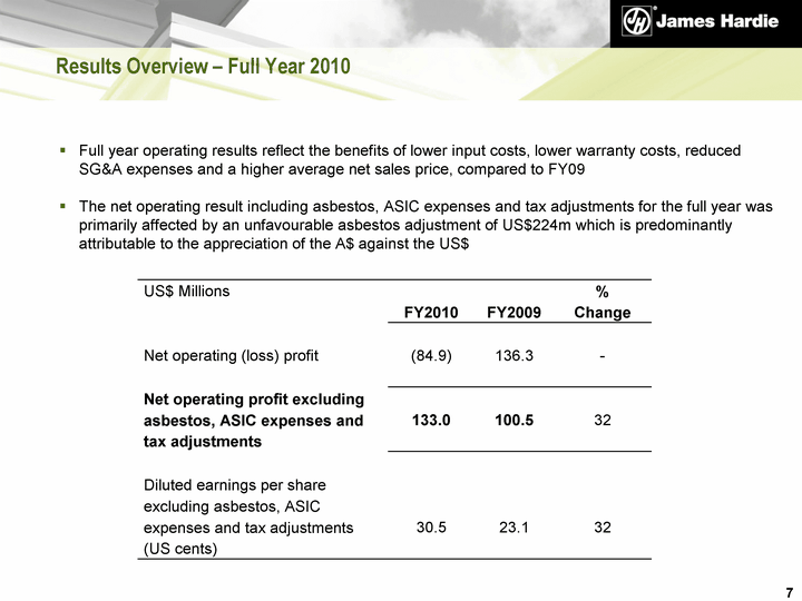 | Results Overview - Full Year 2010 Full year operating results reflect the benefits of lower input costs, lower warranty costs, reduced SG&A expenses and a higher average net sales price, compared to FY09 The net operating result including asbestos, ASIC expenses and tax adjustments for the full year was primarily affected by an unfavourable asbestos adjustment of US$224m which is predominantly attributable to the appreciation of the A$ against the US$ 7 US$ Millions FY2010 FY2009 % Change Net operating (loss) profit (84.9) 136.3 - - Net operating profit excluding asbestos, ASIC expenses and tax adjustments 133.0 100.5 32 Diluted earnings per share excluding asbestos, ASIC expenses and tax adjustments (US cents) 30.5 23.1 32 |