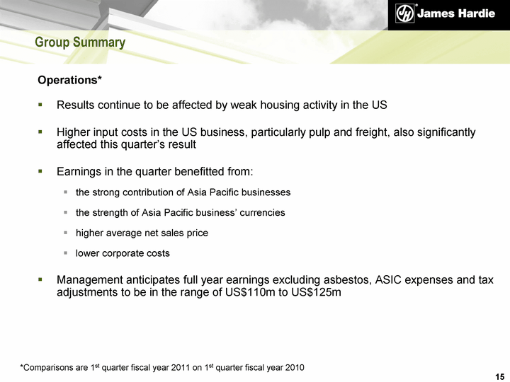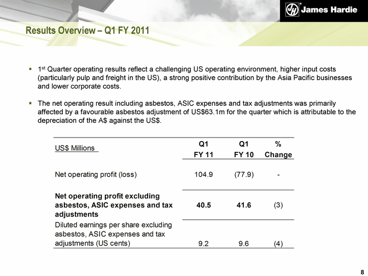 | Results Overview - Q1 FY 2011 1st Quarter operating results reflect a challenging US operating environment, higher input costs (particularly pulp and freight in the US), a strong positive contribution by the Asia Pacific businesses and lower corporate costs. The net operating result including asbestos, ASIC expenses and tax adjustments was primarily affected by a favourable asbestos adjustment of US$63.1m for the quarter which is attributable to the depreciation of the A$ against the US$. 8 |