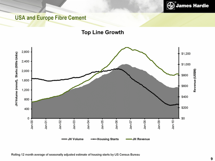 | USA and Europe Fibre Cement Rolling 12 month average of seasonally adjusted estimate of housing starts by US Census Bureau 9 |