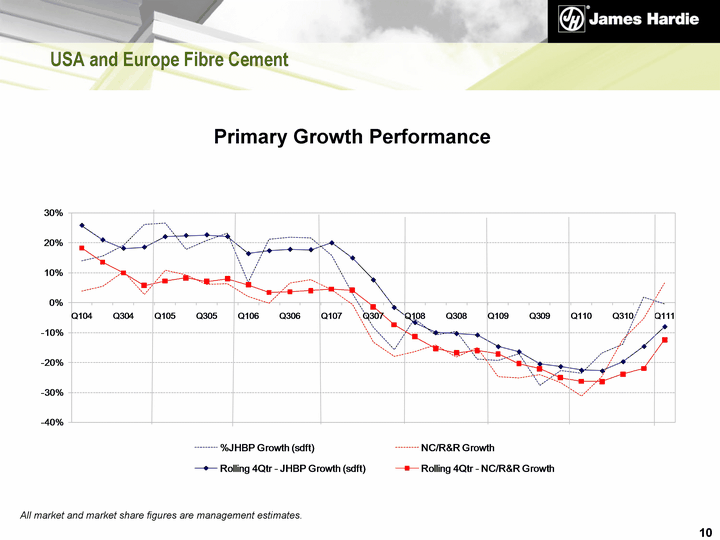 | USA and Europe Fibre Cement Primary Growth Performance All market and market share figures are management estimates. 10 |