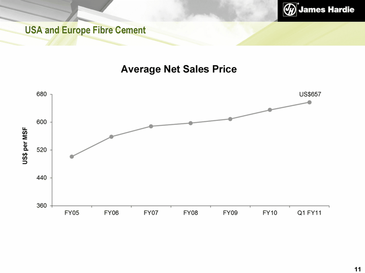 | Average Net Sales Price US$ per MSF USA and Europe Fibre Cement US$657 11 |