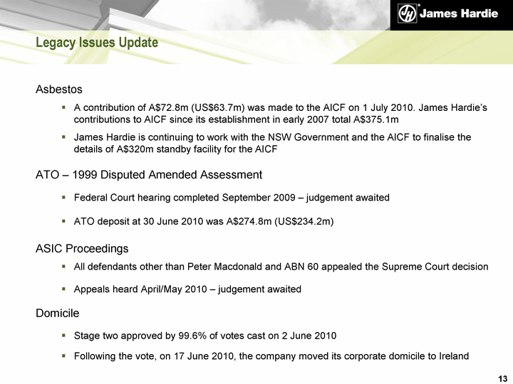 | Legacy Issues Update Asbestos A contribution of A$72.8m (US$63.7m) was made to the AICF on 1 July 2010. James Hardie's contributions to AICF since its establishment in early 2007 total A$375.1m James Hardie is continuing to work with the NSW Government and the AICF to finalise the details of A$320m standby facility for the AICF ATO - 1999 Disputed Amended Assessment Federal Court hearing completed September 2009 - judgement awaited ATO deposit at 30 June 2010 was A$274.8m (US$234.2m) ASIC Proceedings All defendants other than Peter Macdonald and ABN 60 appealed the Supreme Court decision Appeals heard April/May 2010 - judgement awaited Domicile Stage two approved by 99.6% of votes cast on 2 June 2010 Following the vote, on 17 June 2010, the company moved its corporate domicile to Ireland 13 |