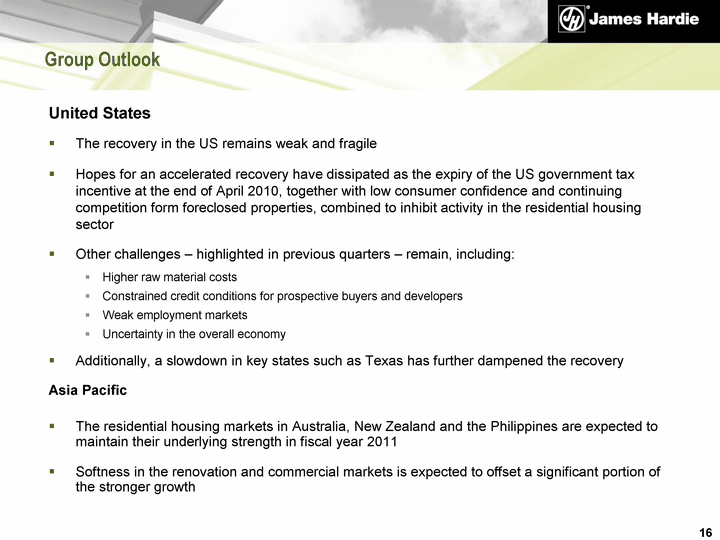 | United States The recovery in the US remains weak and fragile Hopes for an accelerated recovery have dissipated as the expiry of the US government tax incentive at the end of April 2010, together with low consumer confidence and continuing competition form foreclosed properties, combined to inhibit activity in the residential housing sector Other challenges - highlighted in previous quarters - remain, including: Higher raw material costs Constrained credit conditions for prospective buyers and developers Weak employment markets Uncertainty in the overall economy Additionally, a slowdown in key states such as Texas has further dampened the recovery Asia Pacific The residential housing markets in Australia, New Zealand and the Philippines are expected to maintain their underlying strength in fiscal year 2011 Softness in the renovation and commercial markets is expected to offset a significant portion of the stronger growth Group Outlook 16 |