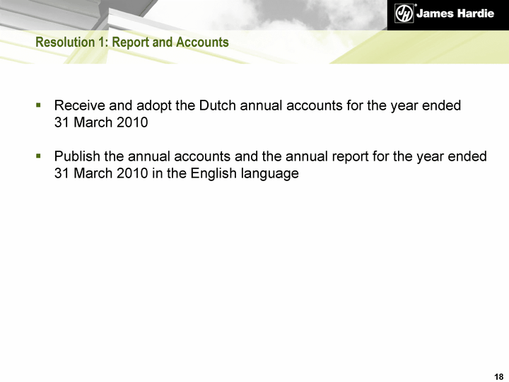 | Receive and adopt the Dutch annual accounts for the year ended 31 March 2010 Publish the annual accounts and the annual report for the year ended 31 March 2010 in the English language 18 Resolution 1: Report and Accounts |