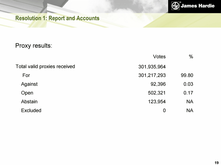 | Resolution 1: Report and Accounts Proxy results: 19 Votes % Total valid proxies received 301,935,964 For 301,217,293 99.80 Against 92,396 0.03 Open 502,321 0.17 Abstain 123,954 NA Excluded 0 NA |