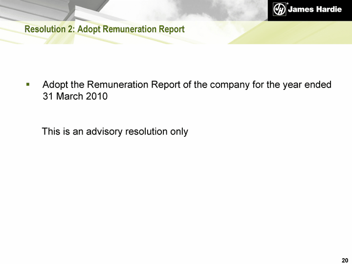 | 20 Resolution 2: Adopt Remuneration Report Adopt the Remuneration Report of the company for the year ended 31 March 2010 This is an advisory resolution only |