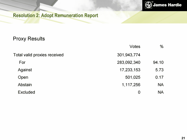 | Resolution 2: Adopt Remuneration Report Proxy Results 21 Votes % Total valid proxies received 301,943,774 For 283,092,340 94.10 Against 17,233,153 5.73 Open 501,025 0.17 Abstain 1,117,256 NA Excluded 0 NA |