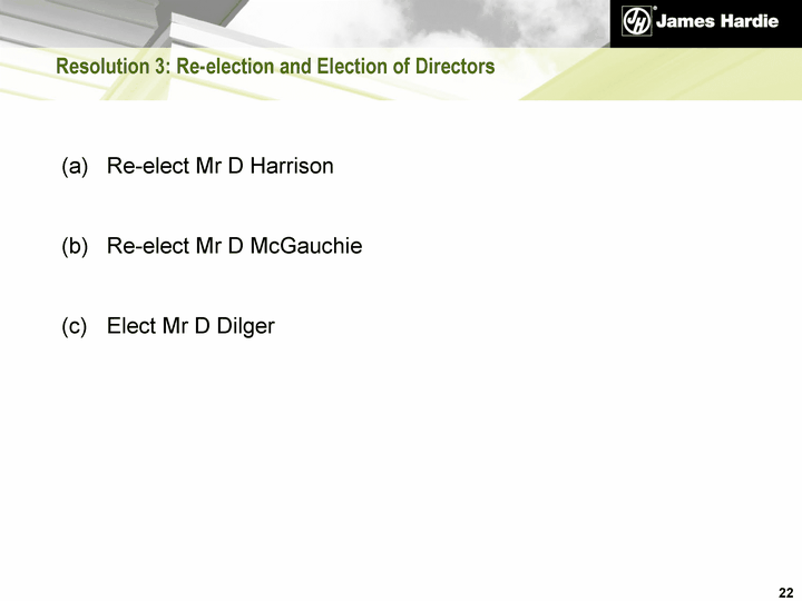 | 22 Resolution 3: Re-election and Election of Directors Re-elect Mr D Harrison Re-elect Mr D McGauchie Elect Mr D Dilger |