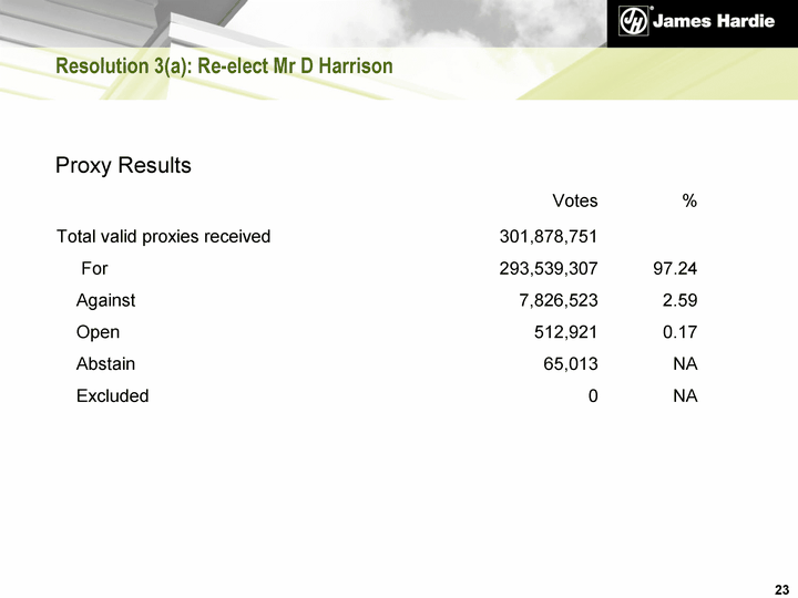 | Resolution 3(a): Re-elect Mr D Harrison Proxy Results 23 Votes % Total valid proxies received 301,878,751 For 293,539,307 97.24 Against 7,826,523 2.59 Open 512,921 0.17 Abstain 65,013 NA Excluded 0 NA |