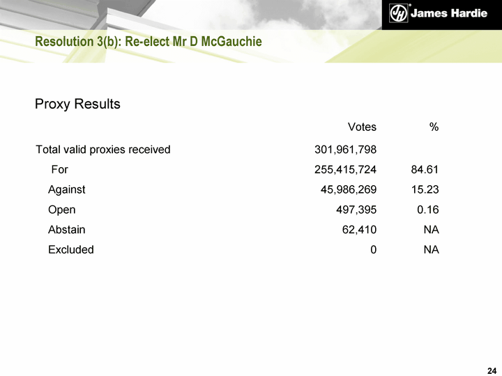 | Resolution 3(b): Re-elect Mr D McGauchie Proxy Results 24 Votes % Total valid proxies received 301,961,798 For 255,415,724 84.61 Against 45,986,269 15.23 Open 497,395 0.16 Abstain 62,410 NA Excluded 0 NA |