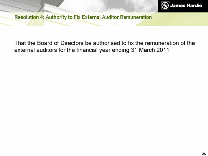 | 26 Resolution 4: Authority to Fix External Auditor Remuneration That the Board of Directors be authorised to fix the remuneration of the external auditors for the financial year ending 31 March 2011 |
