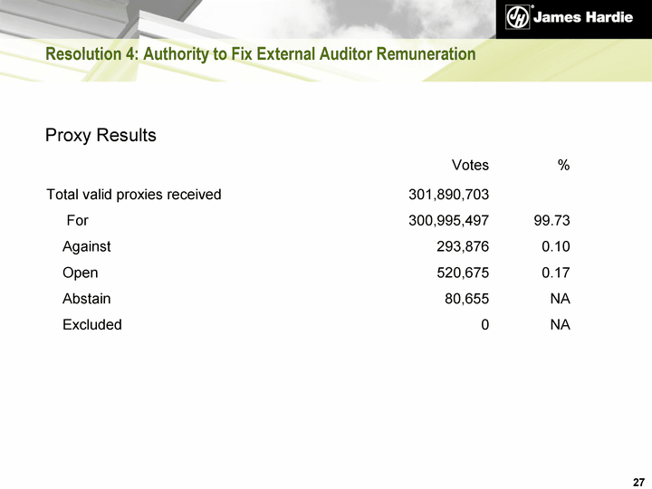 | Resolution 4: Authority to Fix External Auditor Remuneration Proxy Results 27 Votes % Total valid proxies received 301,890,703 For 300,995,497 99.73 Against 293,876 0.10 Open 520,675 0.17 Abstain 80,655 NA Excluded 0 NA |