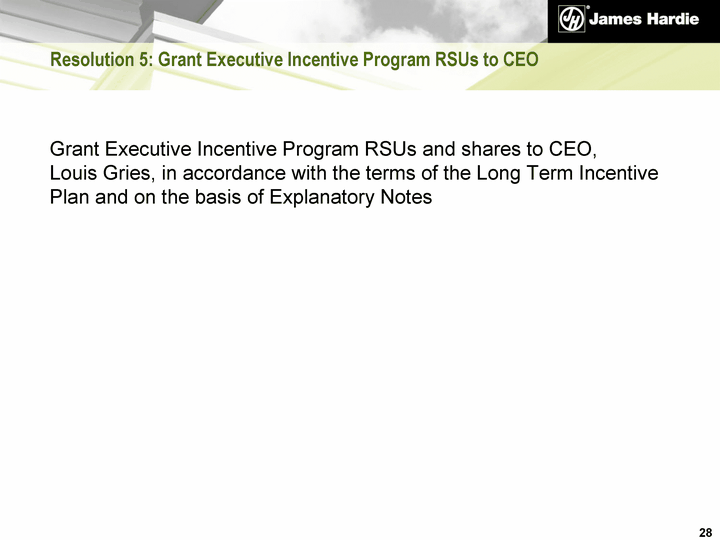 | 28 Resolution 5: Grant Executive Incentive Program RSUs to CEO Grant Executive Incentive Program RSUs and shares to CEO, Louis Gries, in accordance with the terms of the Long Term Incentive Plan and on the basis of Explanatory Notes |