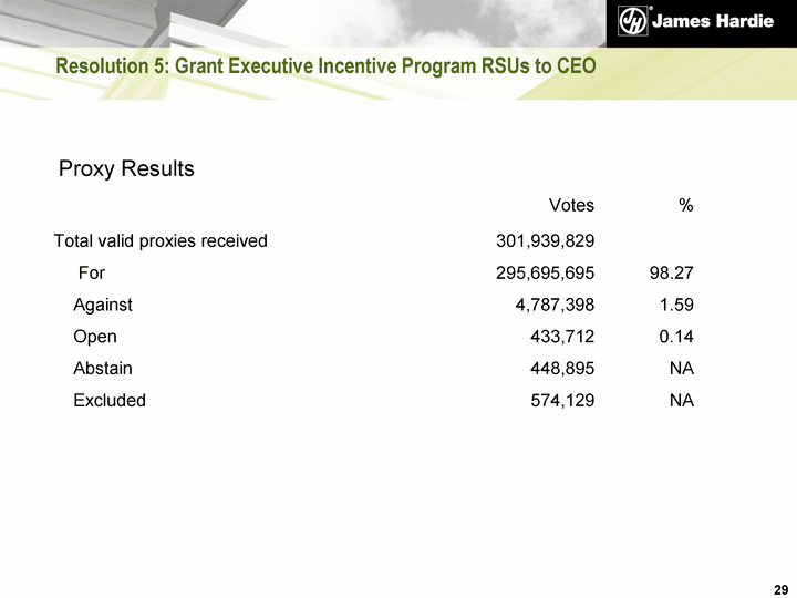 | Resolution 5: Grant Executive Incentive Program RSUs to CEO Proxy Results 29 Votes % Total valid proxies received 301,939,829 For 295,695,695 98.27 Against 4,787,398 1.59 Open 433,712 0.14 Abstain 448,895 NA Excluded 574,129 NA |