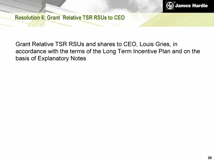 | 30 Resolution 6: Grant Relative TSR RSUs to CEO Grant Relative TSR RSUs and shares to CEO, Louis Gries, in accordance with the terms of the Long Term Incentive Plan and on the basis of Explanatory Notes |