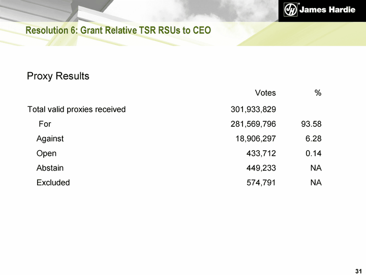 | Resolution 6: Grant Relative TSR RSUs to CEO Proxy Results 31 Votes % Total valid proxies received 301,933,829 For 281,569,796 93.58 Against 18,906,297 6.28 Open 433,712 0.14 Abstain 449,233 NA Excluded 574,791 NA |