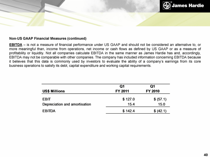 | Non-US GAAP Financial Measures (continued) EBITDA - is not a measure of financial performance under US GAAP and should not be considered an alternative to, or more meaningful than, income from operations, net income or cash flows as defined by US GAAP or as a measure of profitability or liquidity. Not all companies calculate EBITDA in the same manner as James Hardie has and, accordingly, EBITDA may not be comparable with other companies. The company has included information concerning EBITDA because it believes that this data is commonly used by investors to evaluate the ability of a company's earnings from its core business operations to satisfy its debt, capital expenditure and working capital requirements. 40 |