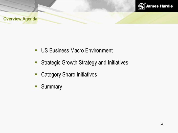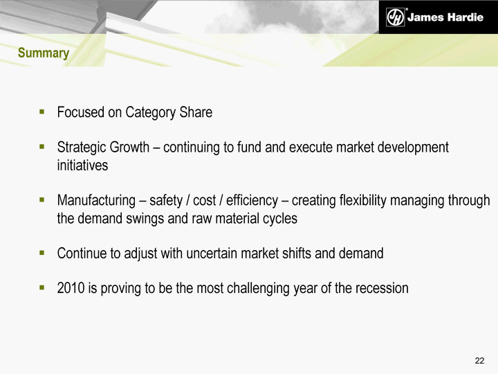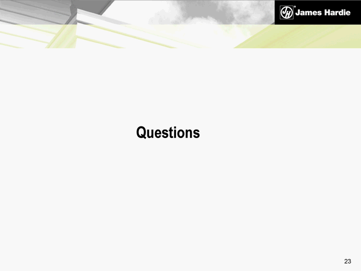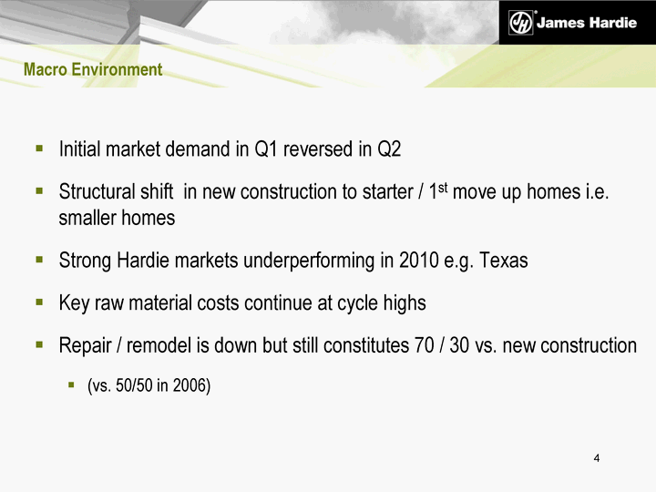 | Disclaimer This Management's Presentation contains forward-looking statements. James Hardie may from time to time make forward-looking statements in its periodic reports filed with or furnished to the United States Securities and Exchange Commission on Forms 20-F and 6-K, in the annual reports to shareholders, in offering circulars, invitation memoranda and prospectuses, in media releases and other written materials and in oral statements made by the Company's officers, directors or employees to analysts, institutional investors, existing and potential lenders, representatives of the media and others. Statements that are not historical facts are forward-looking statements and such forward-looking statements are statements made pursuant to the Safe Harbor Provisions of the Private Securities Litigation Reform Act of 1995. Examples of forward-looking statements include: statements about the Company's future performance; projections of the Company's results of operations or financial condition; statements regarding the Company's plans, objectives or goals, including those relating to its strategies, initiatives, competition, acquisitions, dispositions and/or its products; expectations concerning the costs associated with the suspension or closure of operations at any of the Company's plants and future plans with respect to any such plants; expectations that the Company's credit facilities will be extended or renewed; expectations concerning dividend payments; statements concerning the Company's corporate and tax domiciles and potential changes to them, including potential tax charges; statements regarding tax liabilities and related audits, reviews and proceedings; statements as to the possible consequences of proceedings brought against the Company and certain of its former directors and officers by the ASIC; expectations about the timing and amount of contributions to the AICF, a special purpose fund for the compensation of proven Australian asbestos-related personal injury and death claims; expectations concerning indemnification obligations; statements about product or environmental liabilities; and statements about economic conditions, such as the levels of new home construction, unemployment levels, the availability of mortgages and other financing, mortgage and other interest rates, housing affordability and supply, the levels of foreclosures and home resales, currency exchange rates and consumer confidence. Words such as "believe," "anticipate," "plan," "expect," "intend," "target," "estimate," "project," "predict," "forecast," "guideline," "aim," "will," "should," "likely," "continue" and similar expressions are intended to identify forward- looking statements but are not the exclusive means of identifying such statements. Readers are cautioned not to place undue reliance on these forward-looking statements and all such forward-looking statements are qualified in their entirety by reference to the following cautionary statements. Forward-looking statements are based on the Company's current expectations, estimates and assumptions and because forward-looking statements address future results, events and conditions, they, by their very nature, involve inherent risks and uncertainties, many of which are unforeseeable and beyond the Company's control. Such known and unknown risks, uncertainties and other factors may cause the Company's actual results, performance or other achievements to differ materially from the anticipated results, performance or achievements expressed, projected or implied by these forward-looking statements. These factors, some of which are discussed under "Key Information - Risk Factors" beginning on page 6 of the Form 20-F filed with the US Securities and Exchange Commission on 30 June 2010, include, but are not limited to: all matters relating to or arising out of the prior manufacture of products that contained asbestos by current and former James Hardie subsidiaries; required contributions to the AICF, any shortfall in the AICF and the effect of currency exchange rate movements on the amount recorded in the Company's financial statements as an asbestos liability; proposed governmental loan facility to the AICF; compliance with and changes in tax laws and treatments; competition and product pricing in the markets in which the Company operates; seasonal fluctuations in the demand for our products; the consequences of product failures or defects; exposure to environmental, asbestos or other legal proceedings; general economic and market conditions; the supply and cost of raw materials; the success of research and development efforts; the potential that competitors could copy our products; reliance on a small number of customers; a customer's inability to pay; compliance with and changes in environmental and health and safety laws; risks of conducting business internationally; compliance with and changes in laws and regulations; the effect of the Company's transfer of its corporate domicile from The Netherlands to Ireland to become an Irish SE including employee relations, changes in corporate governance, potential tax benefits and the effect of any negative publicity; currency exchange risks; the concentration of the Company's customer base on large format retail customers, distributors and dealers; the effect of natural disasters; changes in the Company's key management personnel; inherent limitations on internal controls; use of accounting estimates; and all other risks identified in the Company's reports filed with Australian, Irish and US securities agencies and exchanges (as appropriate). The Company cautions that the foregoing list of factors is not exhaustive and that other risks and uncertainties may cause actual results to differ materially from those in forward-looking statements. Forward-looking statements speak only as of the date they are made and are statements of the Company's current expectations concerning future results, events and conditions