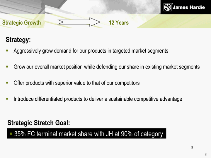 | 5 5 Strategic Growth 12 Years Strategy: Aggressively grow demand for our products in targeted market segments Grow our overall market position while defending our share in existing market segments Offer products with superior value to that of our competitors Introduce differentiated products to deliver a sustainable competitive advantage Strategic Stretch Goal: 35% FC terminal market share with JH at 90% of category |