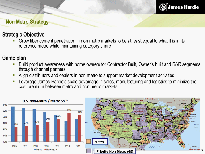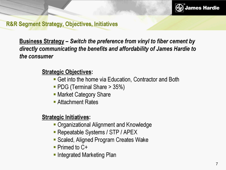 | Non Metro Strategy Strategic Objective Grow fiber cement penetration in non metro markets to be at least equal to what it is in its reference metro while maintaining category share Game plan Build product awareness with home owners for Contractor Built, Owner's built and R&R segments through channel partners Align distributors and dealers in non metro to support market development activities Leverage James Hardie's scale advantage in sales, manufacturing and logistics to minimize the cost premium between metro and non metro markets 6 Priority Non Metro (45) Metro 6 |