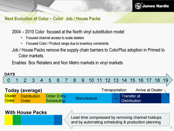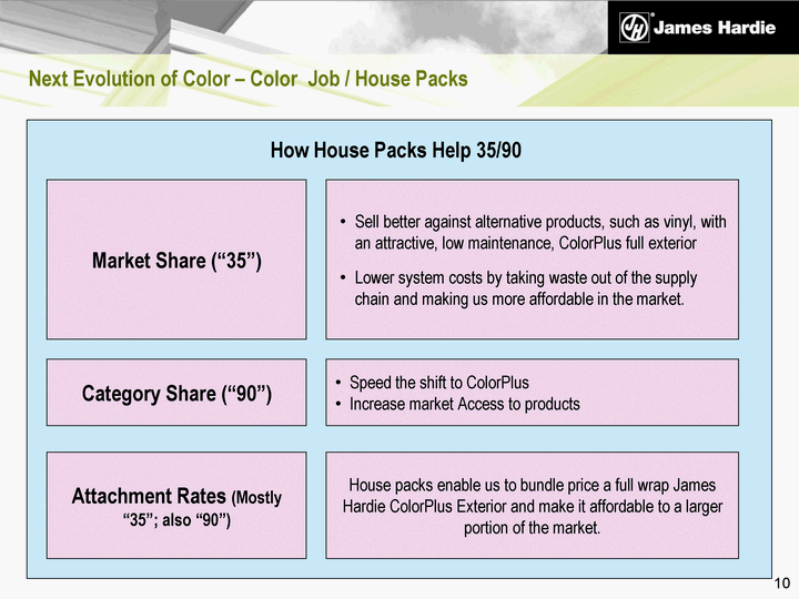 | 0 1 2 3 4 5 6 7 8 9 10 11 12 13 14 15 16 17 18 19 2004 - 2010 Color focused at the North vinyl substitution model Focused channel access to scale dealers Focused Color / Product range due to inventory constraints Job / House Packs remove the supply chain barriers to ColorPlus adoption in Primed to Color markets. Enables Box Retailers and Non Metro markets in vinyl markets 9 Arrive at Dealer Manufacture Dealer Order Transfer at Distribution Distribution Order Order Entry, Scheduling Transportation DAYS Today (average) With House Packs Lead time compressed by removing channel holdups and by automating scheduling & production planning Next Evolution of Color - Color Job / House Packs |