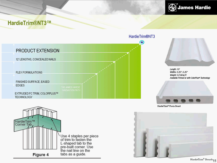 | 11 HardieTrim(r)NT3(tm) HardieTrim(r)NT3 EXTRUDED FC TRIM, COLORPLUS(tm) TECHNOLOGY FINISHED SURFACE, EASED EDGES FLEX FORMULATIONS 12' LENGTHS, CONCEALED NAILS THE JAMES HARDIE INNOVATION PATH PRODUCT EXTENSION 11 |