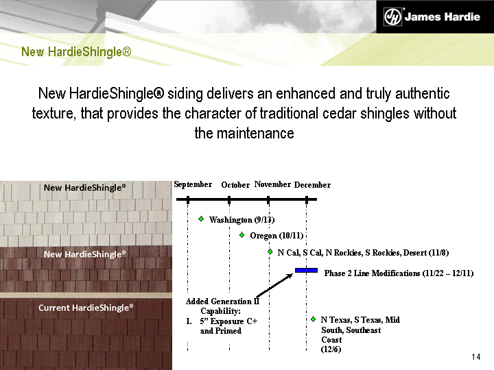 | New HardieShingle(r) September October November December Oregon (10/11) N Cal, S Cal, N Rockies, S Rockies, Desert (11/8) N Texas, S Texas, Mid South, Southeast Coast (12/6) Phase 2 Line Modifications (11/22 - 12/11) Added Generation II Capability: 5" Exposure C+ and Primed Washington (9/13) New HardieShingle(r) siding delivers an enhanced and truly authentic texture, that provides the character of traditional cedar shingles without the maintenance 14 |