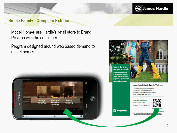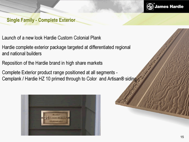 | Single Family - Complete Exterior Launch of a new look Hardie Custom Colonial Plank Hardie complete exterior package targeted at differentiated regional and national builders Reposition of the Hardie brand in high share markets Complete Exterior product range positioned at all segments - Cemplank / Hardie HZ 10 primed through to Color and Artisan(r) siding 15 |