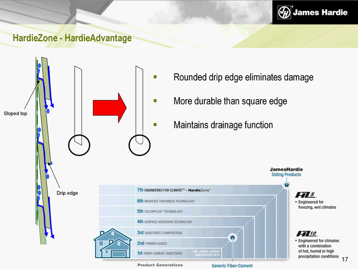 | HardieZone - HardieAdvantage Drip edge Sloped top Rounded drip edge eliminates damage More durable than square edge Maintains drainage function 17 |