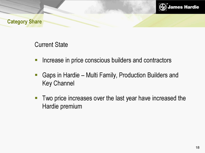 | Category Share Current State Increase in price conscious builders and contractors Gaps in Hardie - Multi Family, Production Builders and Key Channel Two price increases over the last year have increased the Hardie premium 18 |