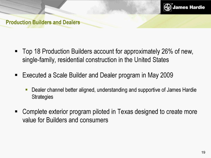 | Production Builders and Dealers Top 18 Production Builders account for approximately 26% of new, single-family, residential construction in the United States Executed a Scale Builder and Dealer program in May 2009 Dealer channel better aligned, understanding and supportive of James Hardie Strategies Complete exterior program piloted in Texas designed to create more value for Builders and consumers 19 |