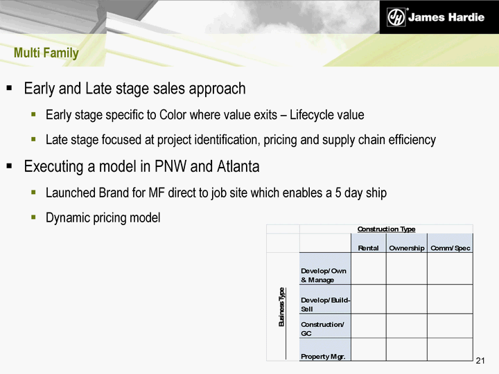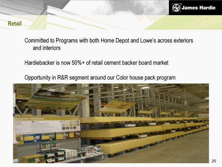 | Retail Committed to Programs with both Home Depot and Lowe's across exteriors and interiors Hardiebacker is now 50%+ of retail cement backer board market Opportunity in R&R segment around our Color house pack program 20 |
