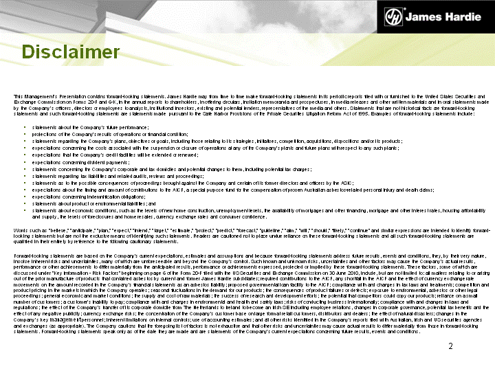 This Management's Presentation contains forward-looking statements. James Hardie may from time to time make forward-looking statements in its periodic reports filed with or furnished to the United States Securities and
