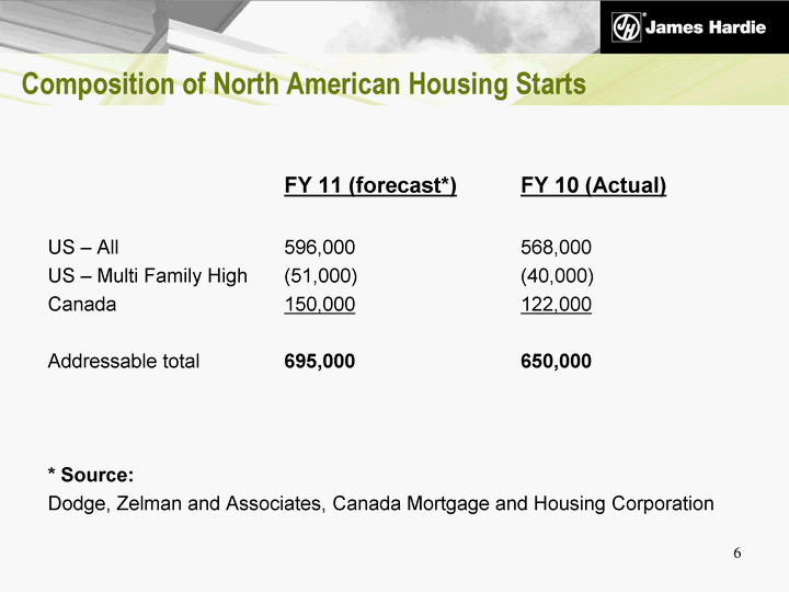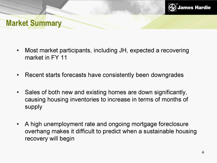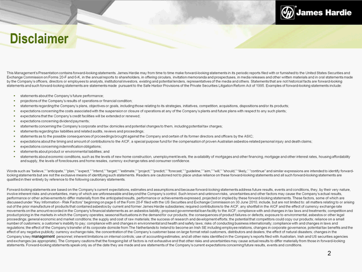 Disclaimer This Management's Presentation contains forward-looking statements. James Hardie may from time to time make forward-looking statements in its periodic reports filed with or furnished to the United States Securities and Exchange Commission on Forms 20-F and 6-K, in the annual reports to shareholders, in offering circulars, invitation memoranda and prospectuses, in media releases and other written materials and in oral statements made by the Company's officers, directors or employees to analysts, institutional investors, existing and potential lenders, representatives of the media and others. Statements that are not historical facts are forward-looking statements and such forward-looking statements are statements made pursuant to the Safe Harbor Provisions of the Private Securities Litigation Reform Act of 1995. Examples of forward-looking statements include: statements about the Company's future performance; projections of the Company's results of operations or financial condition; statements regarding the Company's plans, objectives or goals, including those relating to its strategies, initiatives, competition, acquisitions, dispositions and/or its products; expectations concerning the costs associated with the suspension or closure of operations at any of the Company's plants and future plans with respect to any such plants; expectations that the Company's credit facilities will be extended or renewed; expectations concerning dividend payments; statements concerning the Company's corporate and tax domiciles and potential changes to them, including potential tax charges; statements regarding tax liabilities and related audits, reviews and proceedings; statements as to the possible consequences of proceedings brought against the Company and certain of its former directors and officers by the ASIC; expectations about the timing and amount of contributions to the AICF, a special purpose fund for the compensation of proven Australian asbestos-related personal injury and death claims; expectations concerning indemnification obligations; statements about product or environmental liabilities; and statements about economic conditions, such as the levels of new home construction, unemployment levels, the availability of mortgages and other financing, mortgage and other interest rates, housing affordability and supply, the levels of foreclosures and home resales, currency exchange rates and consumer confidence. Words such as "believe," "anticipate," "plan," "expect," "intend," "target," "estimate," "project," "predict," "forecast," "guideline," "aim," "will," "should," "likely," "continue" and similar expressions are intended to identify forward- looking statements but are not the exclusive means of identifying such statements. Readers are cautioned not to place undue reliance on these forward-looking statements and all such forward-looking statements are qualified in their entirety by reference to the following cautionary statements. Forward-looking statements are based on the Company's current expectations, estimates and assumptions and because forward-looking statements address future results, events and conditions, they, by their very nature, involve inherent risks and uncertainties, many of which are unforeseeable and beyond the Company's control. Such known and unknown risks, uncertainties and other factors may cause the Company's actual results, performance or other achievements to differ materially from the anticipated results, performance or achievements expressed, projected or implied by these forward-looking statements. These factors, some of which are discussed under "Key Information - Risk Factors" beginning on page 6 of the Form 20-F filed with the US Securities and Exchange Commission on 30 June 2010, include, but are not limited to: all matters relating to or arising out of the prior manufacture of products that contained asbestos by current and former James Hardie subsidiaries; required contributions to the AICF, any shortfall in the AICF and the effect of currency exchange rate movements on the amount recorded in the Company's financial statements as an asbestos liability; proposed governmental loan facility to the AICF; compliance with and changes in tax laws and treatments; competition and product pricing in the markets in which the Company operates; seasonal fluctuations in the demand for our products; the consequences of product failures or defects; exposure to environmental, asbestos or other legal proceedings; general economic and market conditions; the supply and cost of raw materials; the success of research and development efforts; the potential that competitors could copy our products; reliance on a small number of customers; a customer's inability to pay; compliance with and changes in environmental and health and safety laws; risks of conducting business internationally; compliance with and changes in laws and regulations; the effect of the Company's transfer of its corporate domicile from The Netherlands to Ireland to become an Irish SE including employee relations, changes in corporate governance, potential tax benefits and the effect of any negative publicity; currency exchange risks; the concentration of the Company's customer base on large format retail customers, distributors and dealers; the effect of natural disasters; changes in the Company's key management personnel; inherent limitations on internal controls; use of accounting estimates; and all other risks identified in the Company's reports filed with Australian, Irish and US securities agencies and exchanges (as appropriate). The Company cautions that the foregoing list of factors is not exhaustive and that other risks and uncertainties may cause actual results to differ materially from those in forward-looking statements. Forward-looking statements speak only as of the date they are made and are statements of the Company's current expectations concerning future results, events and conditions. 