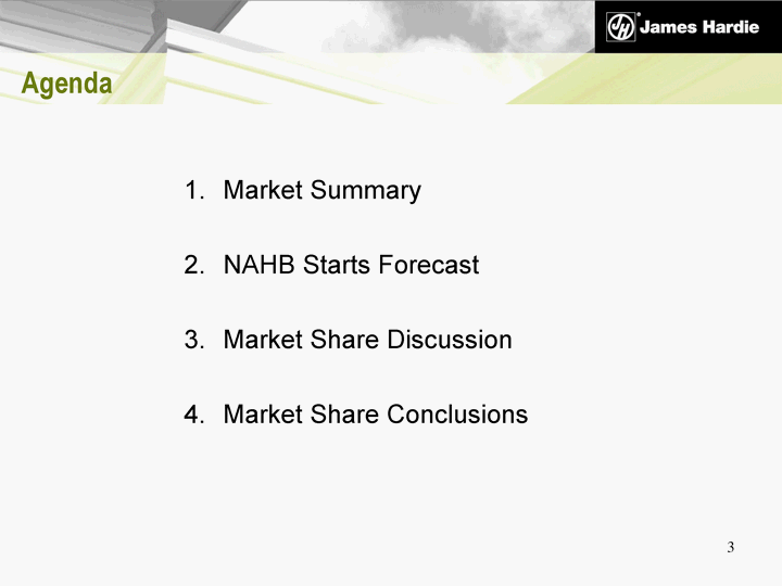 Agenda Market Summary NAHB Starts Forecast Market Share Discussion Market Share Conclusions 3