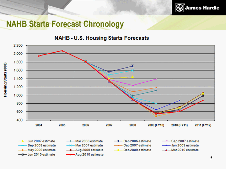 Market Summary Most market participants, including JH, expected a recovering market in FY 11 Recent starts forecasts have consistently been downgrades Sales of both new and existing homes are down significantly, causing housing inventories to increase in terms of months of supply A high unemployment rate and ongoing mortgage foreclosure overhang makes it difficult to predict when a sustainable housing recovery will begin 4