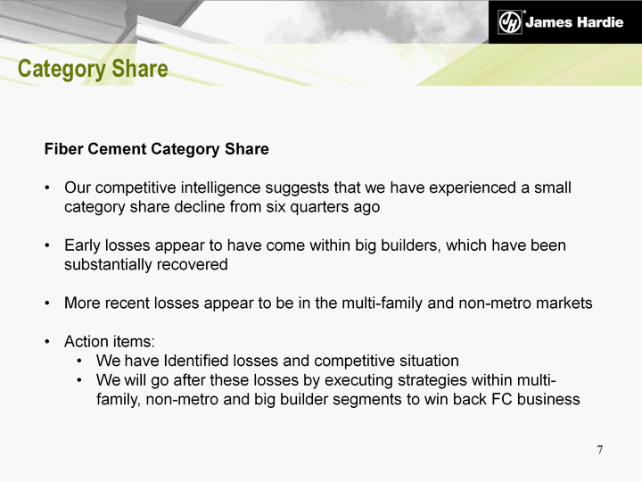 Category Share Fiber Cement Category Share Our competitive intelligence suggests that we have experienced a small category share decline from six quarters ago Early losses appear to have come within big builders, which have been substantially recovered More recent losses appear to be in the multi-family and non-metro markets Action items: We have Identified losses and competitive situation We will go after these losses by executing strategies within multi- family, non-metro and big builder segments to win back FC business 7