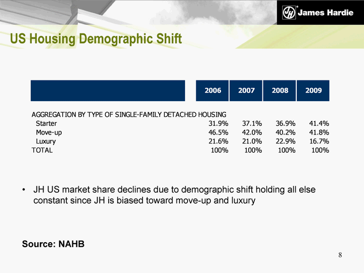 US Housing Demographic Shift JH US market share declines due to demographic shift holding all else constant since JH is biased toward move-up and luxury Source: NAHB 8