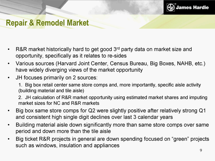Repair & Remodel Market R&R market historically hard to get good 3rd party data on market size and opportunity, specifically as it relates to re-sides Various sources (Harvard Joint Center, Census Bureau, Big Boxes, NAHB, etc.) have widely diverging views of the market opportunity JH focuses primarily on 2 sources: 1. Big box retail center same store comps and, more importantly, specific aisle activity (building material and tile aisle) 2. JH calculation of R&R market opportunity using estimated market shares and imputing market sizes for NC and R&R markets Big box same store comps for Q2 were slightly positive after relatively strong Q1 and consistent high single digit declines over last 3 calendar years Building material aisle down significantly more than same store comps over same period and down more than the tile aisle Big ticket R&R projects in general are down spending focused on "green" projects such as windows, insulation and appliances 9