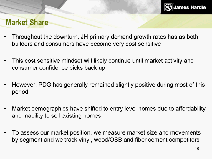 Market Share Throughout the downturn, JH primary demand growth rates has as both builders and consumers have become very cost sensitive This cost sensitive mindset will likely continue until market activity and consumer confidence picks back up However, PDG has generally remained slightly positive during most of this period Market demographics have shifted to entry level homes due to affordability and inability to sell existing homes To assess our market position, we measure market size and movements by segment and we track vinyl, wood/OSB and fiber cement competitors 10