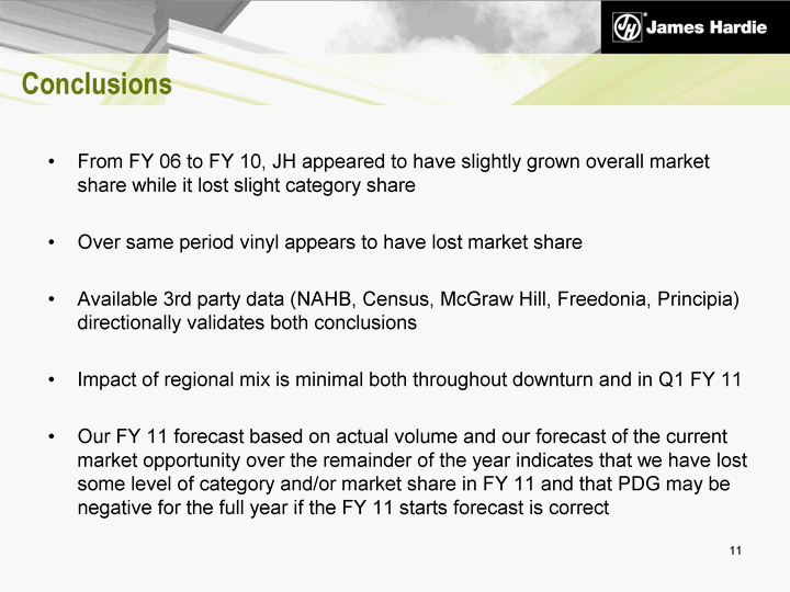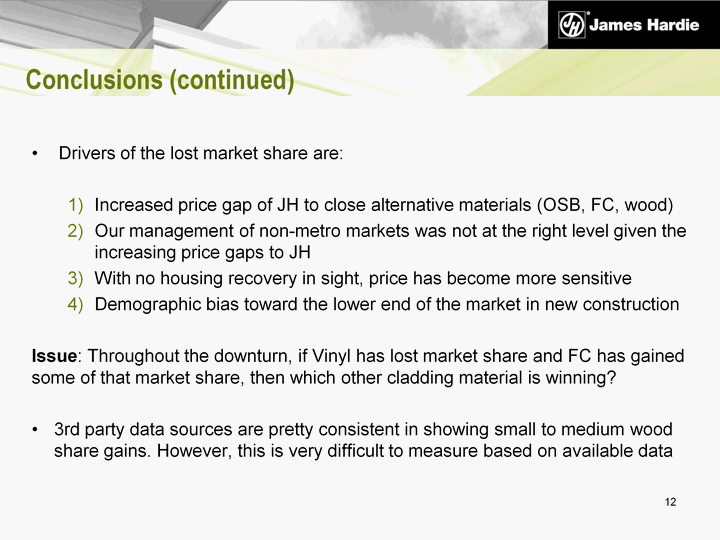 Conclusions From FY 06 to FY 10, JH appeared to have slightly grown overall market share while it lost slight category share Over same period vinyl appears to have lost market share Available 3rd party data (NAHB, Census, McGraw Hill, Freedonia, Principia) directionally validates both conclusions Impact of regional mix is minimal both throughout downturn and in Q1 FY 11 Our FY 11 forecast based on actual volume and our forecast of the current market opportunity over the remainder of the year indicates that we have lost some level of category and/or market share in FY 11 and that PDG may be negative for the full year if the FY 11 starts forecast is correct 11
