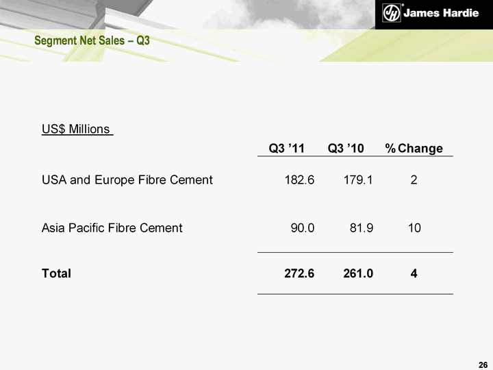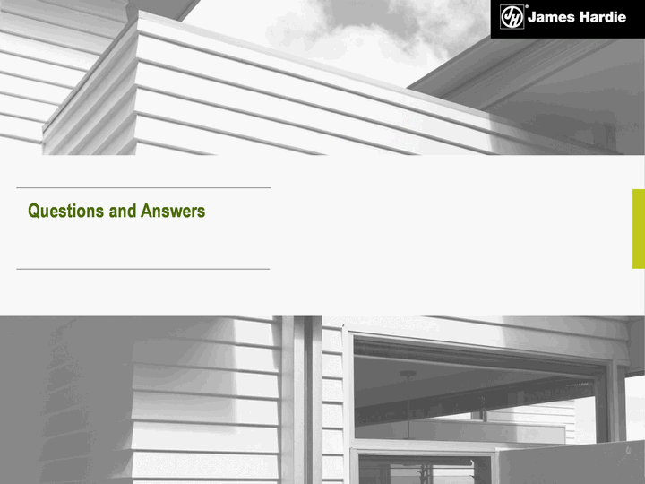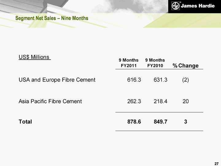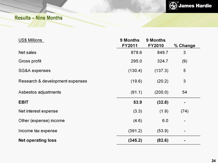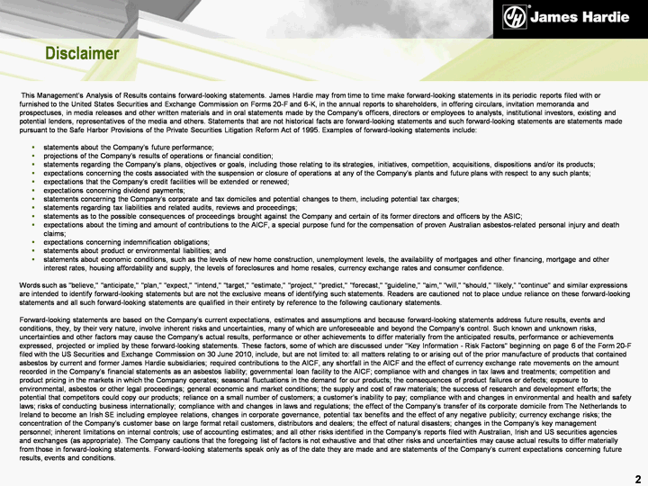 | Disclaimer This Management's Analysis of Results contains forward-looking statements. James Hardie may from time to time make forward-looking statements in its periodic reports filed with or furnished to the United States Securities and Exchange Commission on Forms 20-F and 6-K, in the annual reports to shareholders, in offering circulars, invitation memoranda and prospectuses, in media releases and other written materials and in oral statements made by the Company's officers, directors or employees to analysts, institutional investors, existing and potential lenders, representatives of the media and others. Statements that are not historical facts are forward-looking statements and such forward-looking statements are statements made pursuant to the Safe Harbor Provisions of the Private Securities Litigation Reform Act of 1995. Examples of forward-looking statements include: statements about the Company's future performance; projections of the Company's results of operations or financial condition; statements regarding the Company's plans, objectives or goals, including those relating to its strategies, initiatives, competition, acquisitions, dispositions and/or its products; expectations concerning the costs associated with the suspension or closure of operations at any of the Company's plants and future plans with respect to any such plants; expectations that the Company's credit facilities will be extended or renewed; expectations concerning dividend payments; statements concerning the Company's corporate and tax domiciles and potential changes to them, including potential tax charges; statements regarding tax liabilities and related audits, reviews and proceedings; statements as to the possible consequences of proceedings brought against the Company and certain of its former directors and officers by the ASIC; expectations about the timing and amount of contributions to the AICF, a special purpose fund for the compensation of proven Australian asbestos-related personal injury and death claims; expectations concerning indemnification obligations; statements about product or environmental liabilities; and statements about economic conditions, such as the levels of new home construction, unemployment levels, the availability of mortgages and other financing, mortgage and other interest rates, housing affordability and supply, the levels of foreclosures and home resales, currency exchange rates and consumer confidence. Words such as "believe," "anticipate," "plan," "expect," "intend," "target," "estimate," "project," "predict," "forecast," "guideline," "aim," "will," "should," "likely," "continue" and similar expressions are intended to identify forward-looking statements but are not the exclusive means of identifying such statements. Readers are cautioned not to place undue reliance on these forward-looking statements and all such forward-looking statements are qualified in their entirety by reference to the following cautionary statements. Forward-looking statements are based on the Company's current expectations, estimates and assumptions and because forward-looking statements address future results, events and conditions, they, by their very nature, involve inherent risks and uncertainties, many of which are unforeseeable and beyond the Company's control. Such known and unknown risks, uncertainties and other factors may cause the Company's actual results, performance or other achievements to differ materially from the anticipated results, performance or achievements expressed, projected or implied by these forward-looking statements. These factors, some of which are discussed under "Key Information - Risk Factors" beginning on page 6 of the Form 20-F filed with the US Securities and Exchange Commission on 30 June 2010, include, but are not limited to: all matters relating to or arising out of the prior manufacture of products that contained asbestos by current and former James Hardie subsidiaries; required contributions to the AICF, any shortfall in the AICF and the effect of currency exchange rate movements on the amount recorded in the Company's financial statements as an asbestos liability; governmental loan facility to the AICF; compliance with and changes in tax laws and treatments; competition and product pricing in the markets in which the Company operates; seasonal fluctuations in the demand for our products; the consequences of product failures or defects; exposure to environmental, asbestos or other legal proceedings; general economic and market conditions; the supply and cost of raw materials; the success of research and development efforts; the potential that competitors could copy our products; reliance on a small number of customers; a customer's inability to pay; compliance with and changes in environmental and health and safety laws; risks of conducting business internationally; compliance with and changes in laws and regulations; the effect of the Company's transfer of its corporate domicile from The Netherlands to Ireland to become an Irish SE including employee relations, changes in corporate governance, potential tax benefits and the effect of any negative publicity; currency exchange risks; the concentration of the Company's customer base on large format retail customers, distributors and dealers; the effect of natural disasters; changes in the Company's key management personnel; inherent limitations on internal controls; use of accounting estimates; and all other risks identified in the Company's reports filed with Australian, Irish and US securities agencies and exchanges (as appropriate). The Company cautions that the foregoing list of factors is not exhaustive and that other risks and uncertainties may cause actual results to differ materially from those in forward-looking statements. Forward-looking statements speak only as of the date they are made and are statements of the Company's current expectations concerning future results, events and conditions. 2
