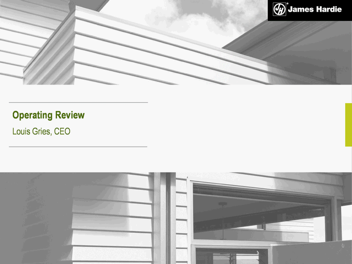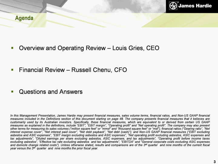 | Agenda Overview and Operating Review - Louis Gries, CEO Financial Review - Russell Chenu, CFO Questions and Answers 3 In this Management Presentation, James Hardie may present financial measures, sales volume terms, financial ratios, and Non-US GAAP financial measures included in the Definitions section of this document starting on page 48. The company presents financial measures that it believes are customarily used by its Australian investors. Specifically, these financial measures, which are equivalent to or derived from certain US GAAP measures as explained in the definitions, include "EBIT", "EBIT margin", "Operating profit" and "Net operating profit". The company may also present other terms for measuring its sales volumes ("million square feet" or "mmsf" and "thousand square feet" or "msf"); financial ratios ("Gearing ratio", "Net interest expense cover", "Net interest paid cover", "Net debt payback", "Net debt (cash)"); and Non-US GAAP financial measures ("EBIT excluding asbestos and ASIC expenses", "EBIT margin excluding asbestos and ASIC expenses", "Net operating profit excluding asbestos, ASIC expenses and tax adjustments", "Diluted earnings per share excluding asbestos, ASIC expenses, and tax adjustments", "Operating profit before income taxes excluding asbestos", "Effective tax rate excluding asbestos and tax adjustments", "EBITDA" and "General corporate costs excluding ASIC expenses and domicile change related costs"). Unless otherwise stated, results and comparisons are of the 3rd quarter and nine months of the current fiscal year versus the 3rd quarter and nine months the prior fiscal year. |