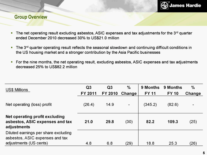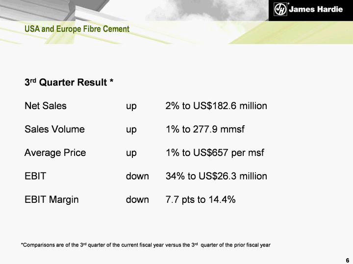 | Group Overview The net operating result excluding asbestos, ASIC expenses and tax adjustments for the 3rd quarter ended December 2010 decreased 30% to US$21.0 million The 3rd quarter operating result reflects the seasonal slowdown and continuing difficult conditions in the US housing market and a stronger contribution by the Asia Pacific businesses For the nine months, the net operating result, excluding asbestos, ASIC expenses and tax adjustments decreased 25% to US$82.2 million 5 |